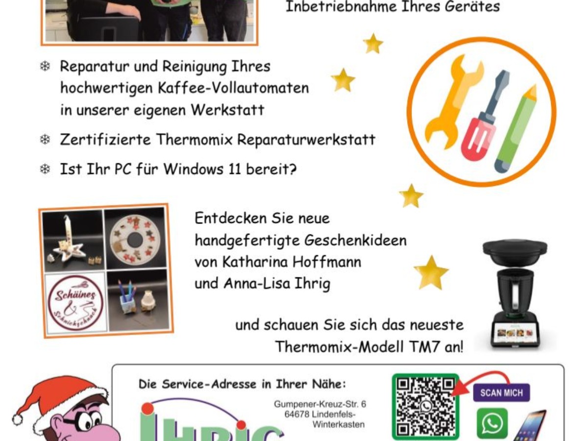 Nutzen Sie diese Gelegenheit, die Technik von Morgen nicht nur in Natura anzuschauen, sondern auch live auszuprobieren und zu erleben. Auch unsere Werkstatt steht Ihnen offen - neben defekter Unterhaltungselektronik und dem bewährten Reinigungs- und Wartungsservice für Kaffee-Vollautomaten kümmert sie sich seit einigen Jahren auch um Thermomix-Geräte.